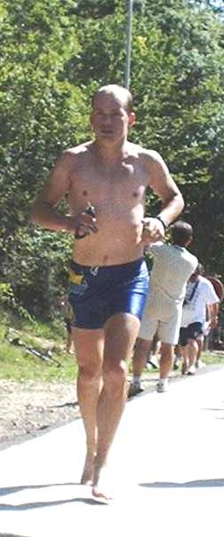 traditionnelle photo d'avant course se prend torse nu. Motif : l'eau étant à 25°, la combinaison de nage est interdite ! Un cas rarissime sur moyenne distance qui déclencha le courroux de bien des triathlètes (5 à 10 minutes de plus sur la facture natation). De gauche à droite : Christian Gailhot, Pascal Garcia, Hervé Rougeot (admirez le concept cuishort) ! Devinette : qui fait des UV ? |