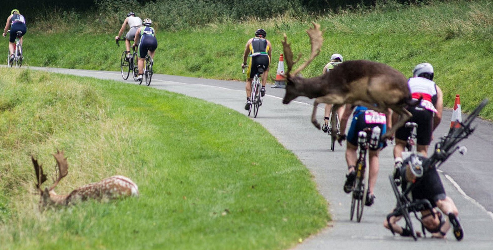 | Il y a dix ans, une concurrente avait percuté un ours lors d'un triathlon dans le Colorado. Moins exotique, mais tout aussi spectaculaire, des cerfs ont souhaité participer au triathlon de Dublin en août dernier. Mais cette fois, un photographe était là ! | ![]() |