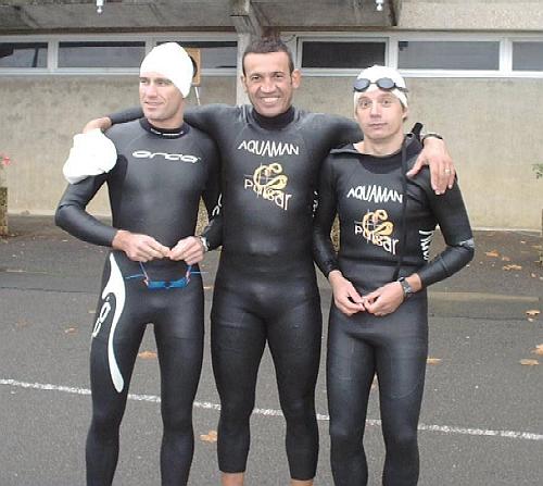 Bien au chaud dans leur néoprène, Claudio, Christian et Pascal prennent la pose avant d'aller se geler dans la Saône. |