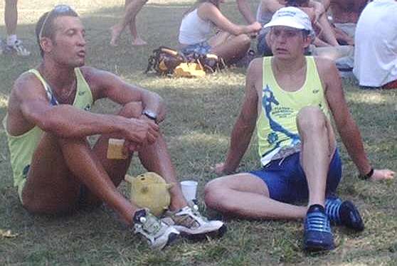 traditionnelle photo d'avant course se prend torse nu. Motif : l'eau étant à 25°, la combinaison de nage est interdite ! Un cas rarissime sur moyenne distance qui déclencha le courroux de bien des triathlètes (5 à 10 minutes de plus sur la facture natation). De gauche à droite : Christian Gailhot, Pascal Garcia, Hervé Rougeot (admirez le concept cuishort) ! Devinette : qui fait des UV ? |