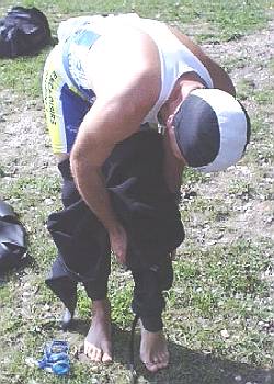 Equipe 1 Julien "Gogol 615" entame la danse rituelle de l'orang-outang sous le regard atterré de Denis (614). Christian "le tahitien" reste indifférent à toute cette agitation, tout comme Hervé, absorbé par le positionnement de ses chaussettes ! |
