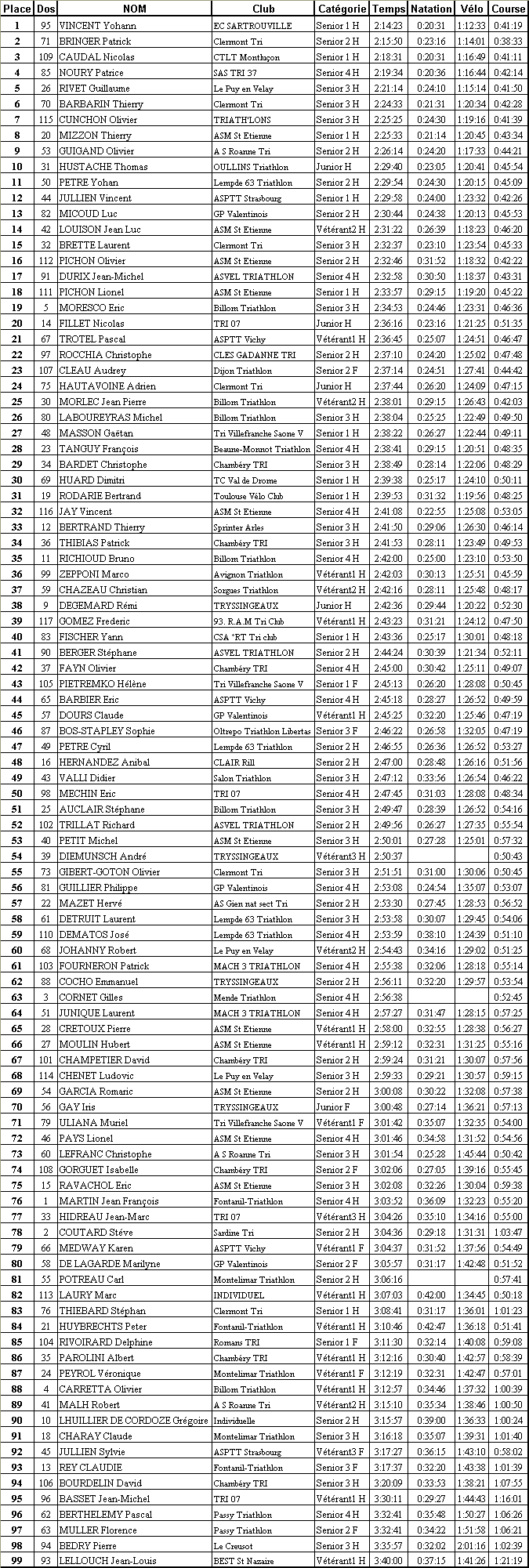 | 1 | Vincent | Yohann | 2:14:23 | 20:31 | 1:12:33 | 41:19 |
